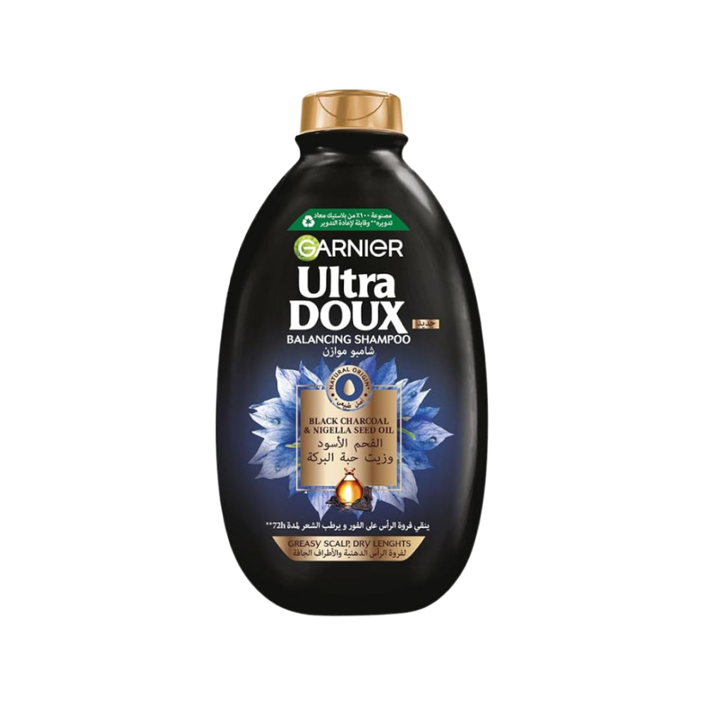 غارنييه الترا دوكس - شامبو بالفحم الأسود وزيت بذور حبة البركة 400 مل هو شامبو مصمم لتنقية فروة الرأس وإزالة الشوائب، حيث يجمع بين الفحم الأسود المعروف بخصائصه المنقية، وزيت بذور حبة البركة الذي يساعد في تهدئة فروة الرأس وتعزيز لمعان الشعر.