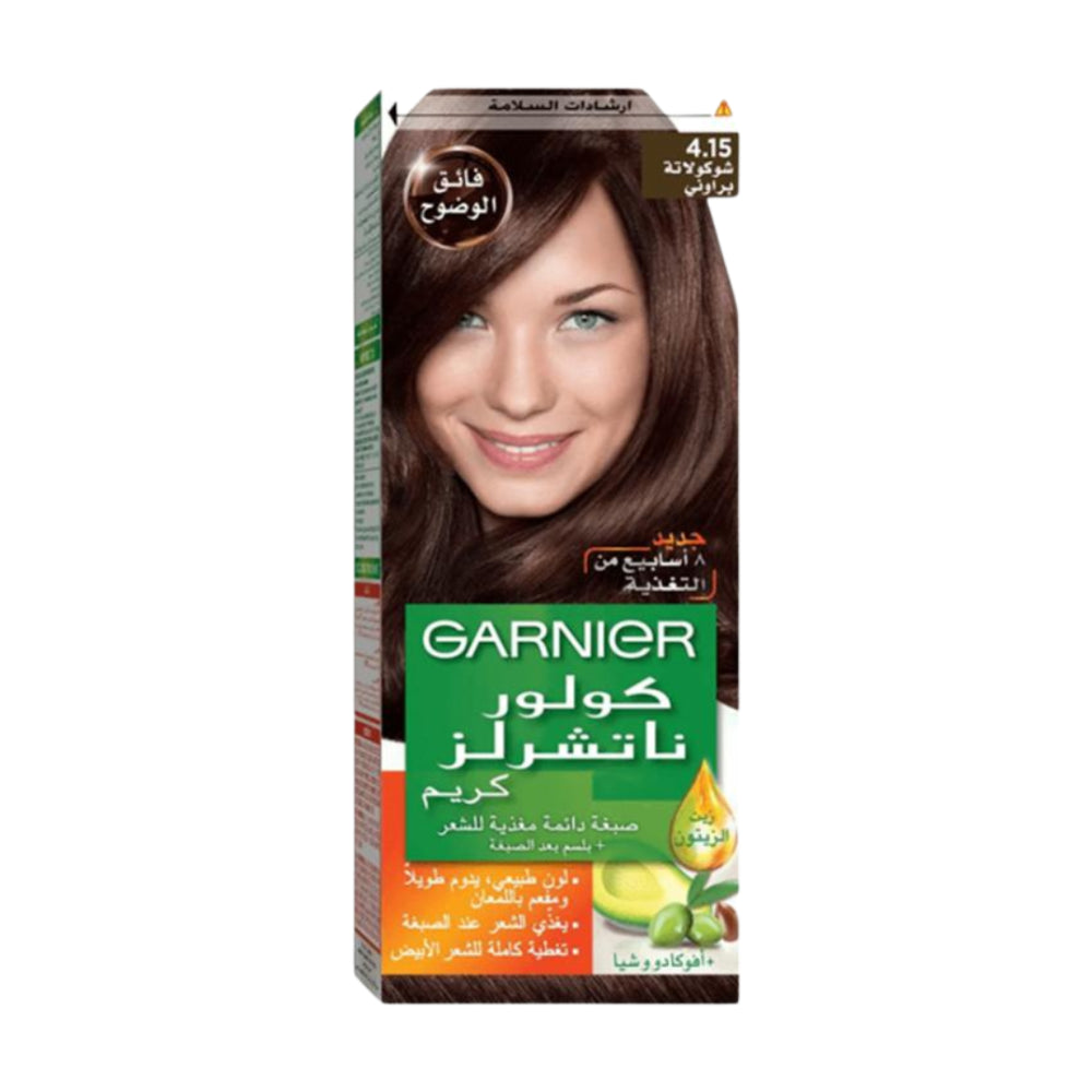 غارنييه صبغة كولور ناتشرلز كريم - شكولاتة برواني 4.15 هي صبغة دائمة تمنح الشعر لونًا غنيًا وطبيعيًا يدوم طويلًا، مع تغطية مثالية للشعر الأبيض بفضل تركيبتها المغذية بزيت الزيتون، زيت الأفوكادو، وزبدة الشيا.